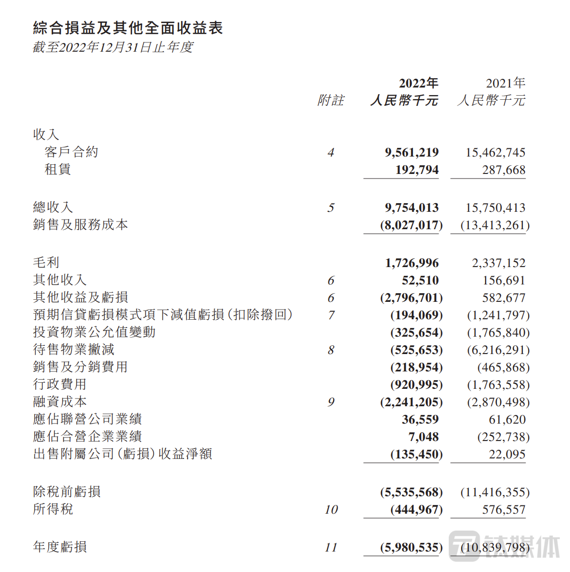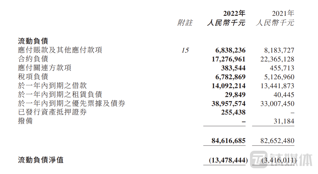 数据显示,2022年,公司总收入约97.54亿元,同比下降38.1%;归母净利润为亏损60.71亿元,同比收窄42%。公司银行结余及现金约11.64亿元,受限制或已抵押银行存款约15.19亿元,资产净值约45.75亿元,流动负债净额约134.78亿元。