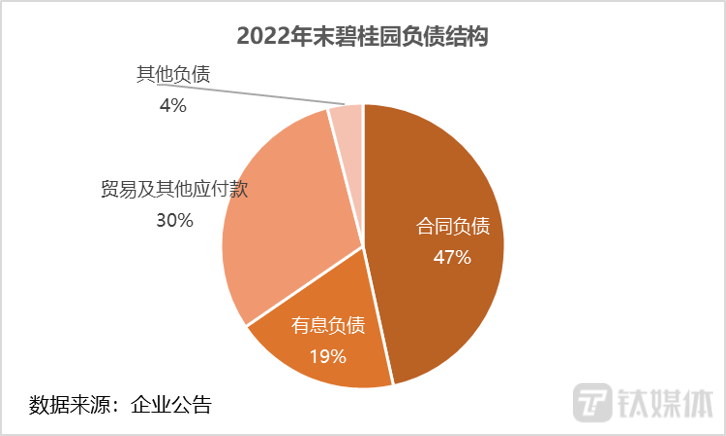 分析其2022年末的负债结构,其中,合同负债6682亿元,有息负债2713亿元,贸易及其他应付款4374亿元,其他负债581亿元。有息负债中银行及其他借款1625亿元、优先票据707亿元、公司债券323亿元。也就是说,碧桂园的债务大头合同负债(是住户的),占比47%;而恒大集团最大的债主是供应商,负债占比41%。