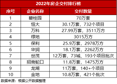 2022年,碧桂园去年交付了70万套,是排在第二第三名恒大、万科的2倍多;占交付数量前50房企的17.5%。2023上半年,碧桂园交付了27.8万套,预计全年交付70万套。