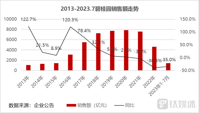 在销售端,碧桂园出现了断崖式下降,2022整年销售额减少2945亿元,跌幅达39%;2023年1–7月,碧桂园实现权益销售金额1408亿元,同比下降35%,较2021年下降61%;7月单月实现权益销售金额121亿元,连续第四个月环比下降,同比下降60%,较2021年下降78%。对比全行业的销售情况,可以看出碧桂园的销售数据缩水程度要更高。