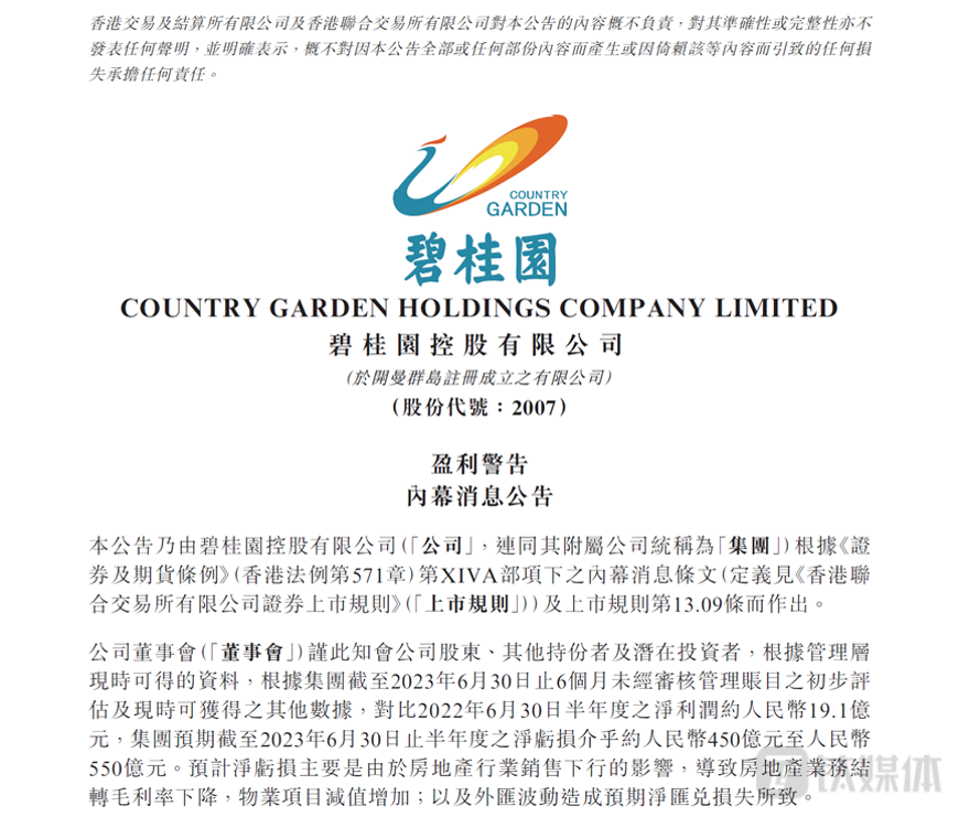 8月10日晚,碧桂园发布“盈利警告内幕消息公告”,称预计2023年上半年的净亏损将介乎450亿-550亿之间。
