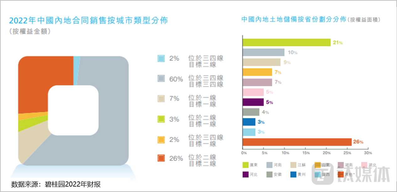 碧桂园前期布局以三四线城市为主,根据其财报显示,截至2022年底,碧桂园在三四线城市的合同销售额占比仍达60%;已经签约或者摘牌的土地,可以建设的房屋面积为2.015亿平方米,79%分布在广东以外,高度分散在各地,土储同样大部分分布在低能级城市中。