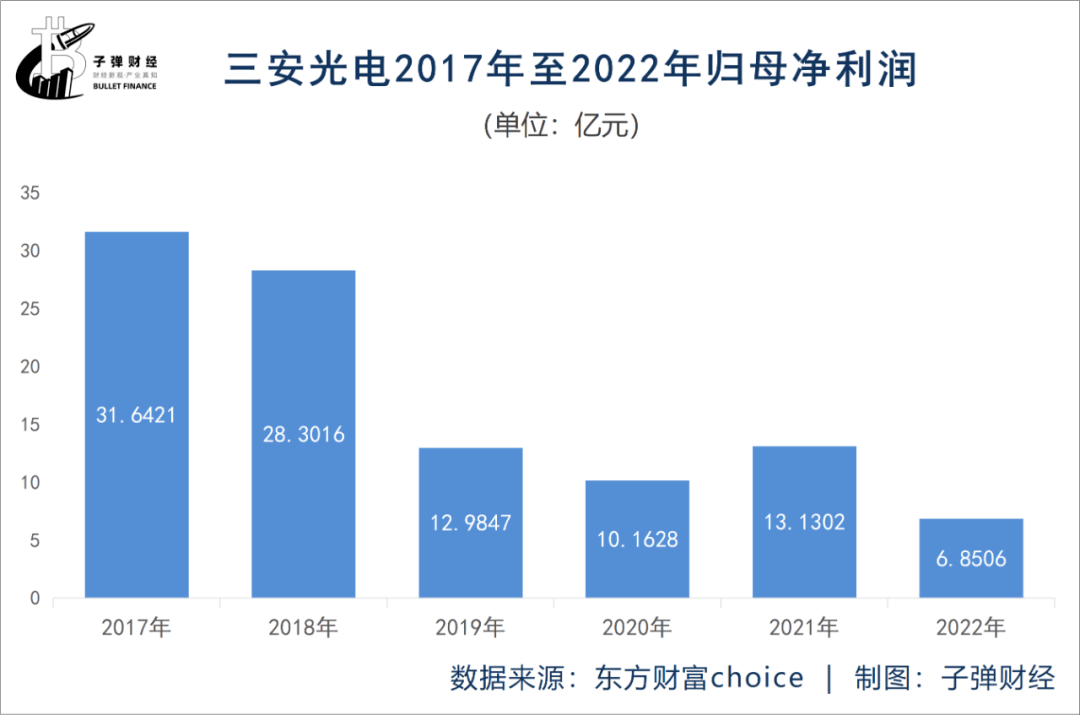 「界面新闻·子弹财经」发现,不止近两年,自2017年三安光电实现31.64亿元归母净利润后,公司盈利能力一直在持续下滑,除2018年归母净利润超过20亿以外,其余年份三安光电净利润均低于15亿元。