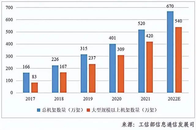 据《中国通信院》公布的数据显示,去年我国数据中心规模稳步增长,按照标准机架2.5kW来统计,2022年我国数据中心机架规模达到670万架,近五年的年复合增长率超过30%。其中大型以上数据中心增长更为迅速,2022年底规模达540万架,占比达81%。