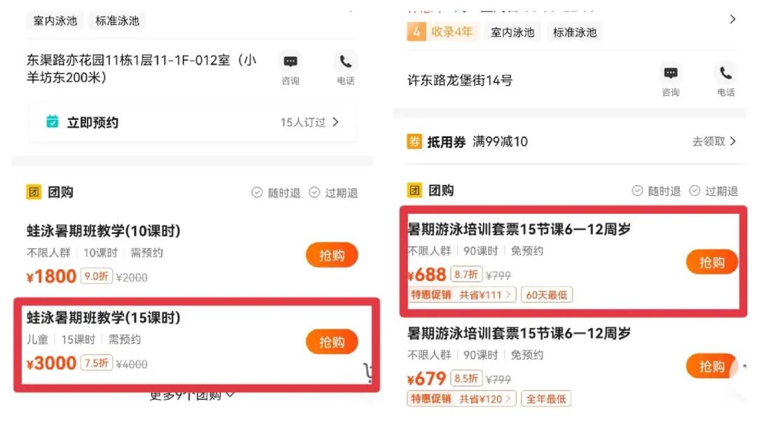 一开始,我先在线上搜索了各种游泳暑期课的团购课程,大多游泳馆15个课时的价格是1800元,30个课时3000元左右。如果再加上一些其他开支,这就意味着,一个暑假两个娃,光游泳课就要花费近万元。