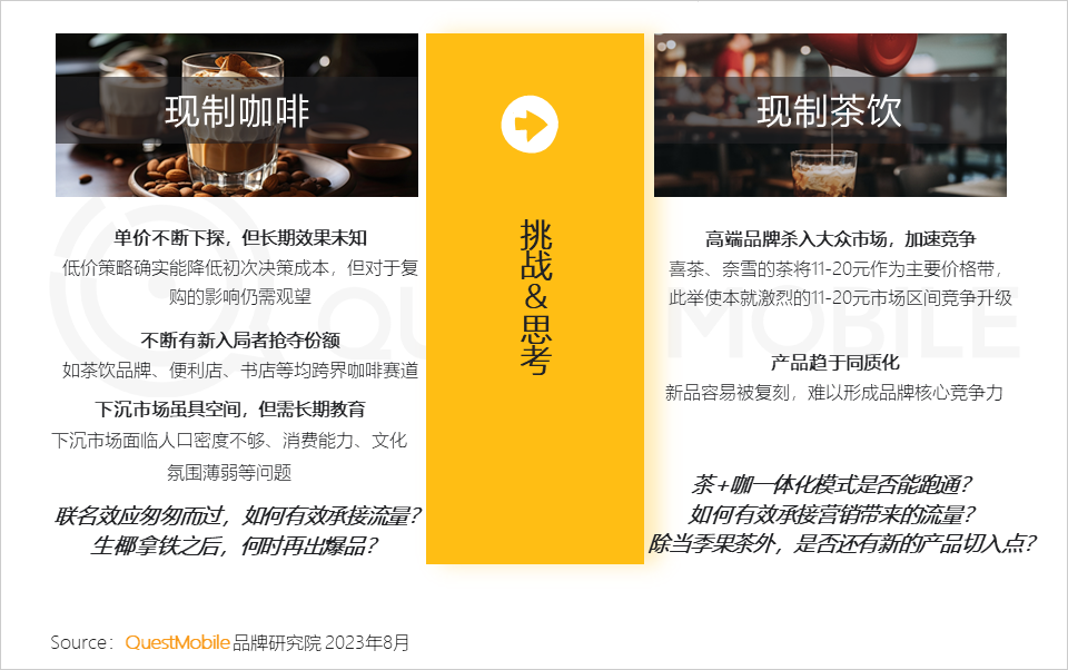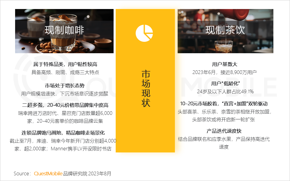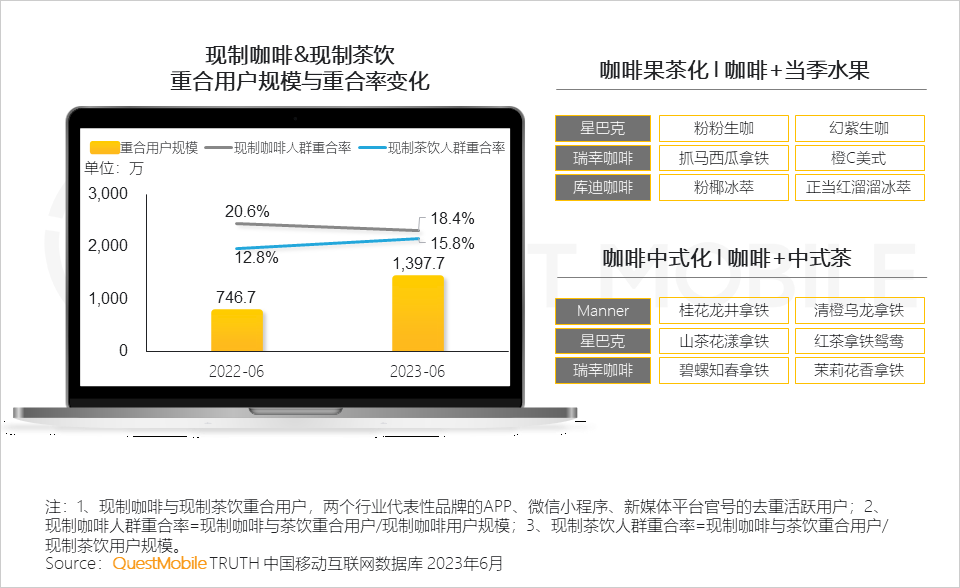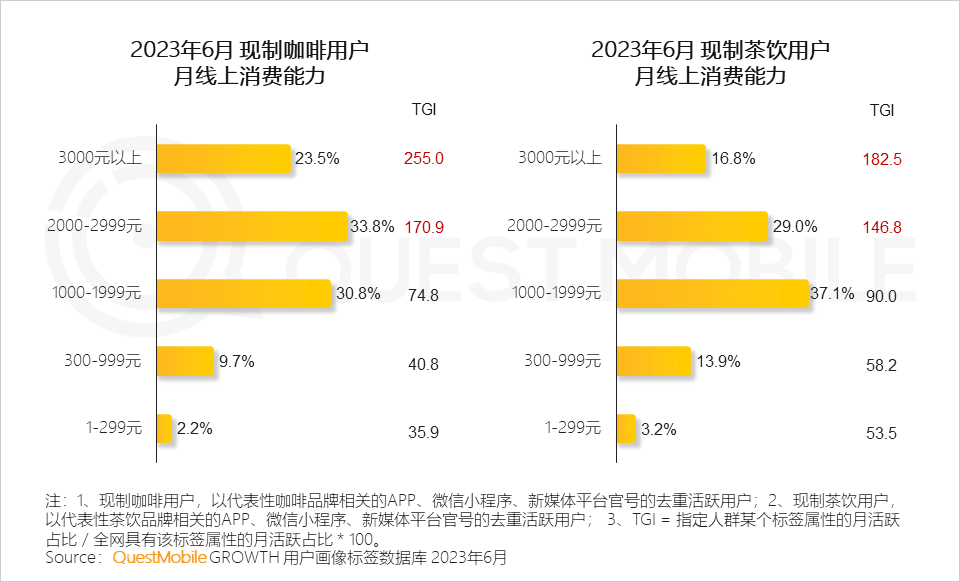 QuestMobile数据显示,2023年6月,现制咖啡消费群体中,月线上消费能力3000元以上用户占比23.5%,对应的现制茶饮群体占比为16.8%。