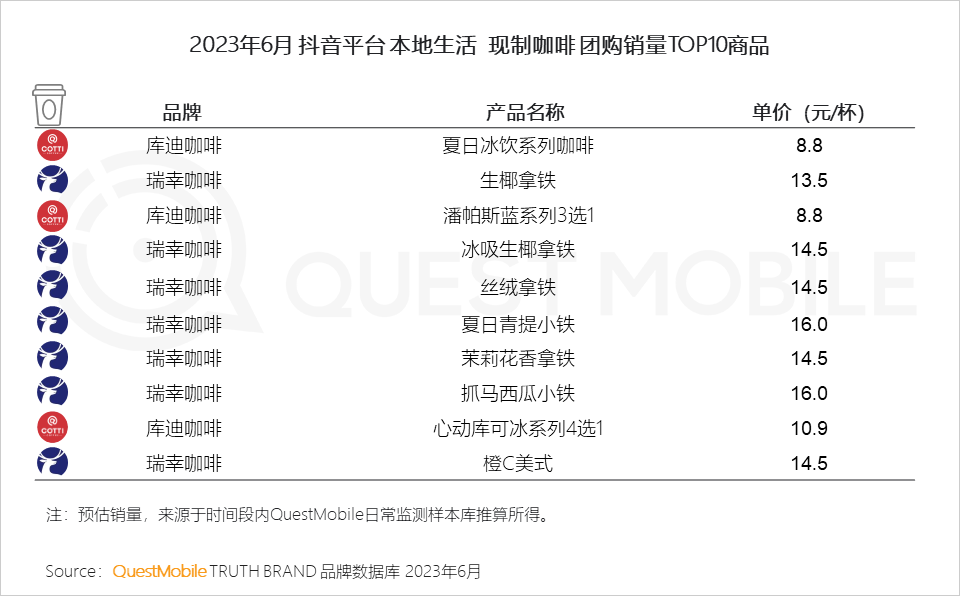 QuestMobile数据显示,2023年6月,抖音本地生活团购板块,咖啡团购TOP1商品为单价8.8元的库迪冰饮系列咖啡,茶饮团购TOP1商品为单价8.7元的蜜雪冰城鲜橙大王桶。