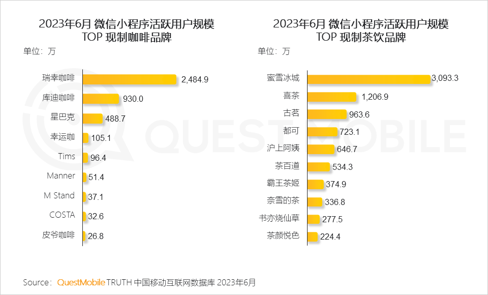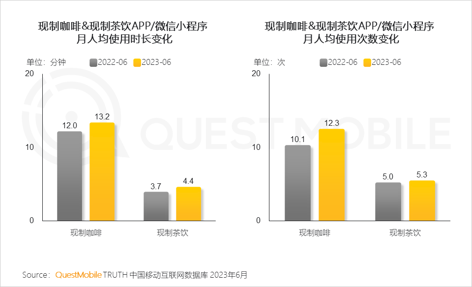 QuestMobile数据显示,2023年6月现制咖啡类APP/微信小程序的月人均使用时长为13.2分钟,月人均使用次数12.3次;对应的现制茶类APP/微信小程序月人均使用时长为4.4分钟,月人均使用次数5.3次。