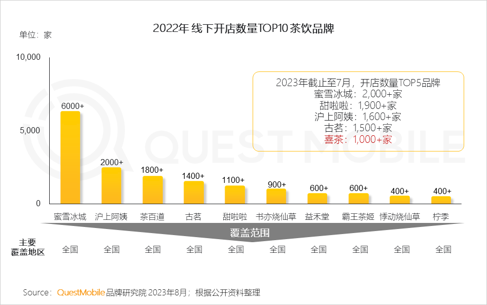 9、得益于放开加盟举措,喜茶2023年门店扩张开启“加速器”,同时沪上阿姨、古茗、茶百道等中端品牌持续向万店冲刺