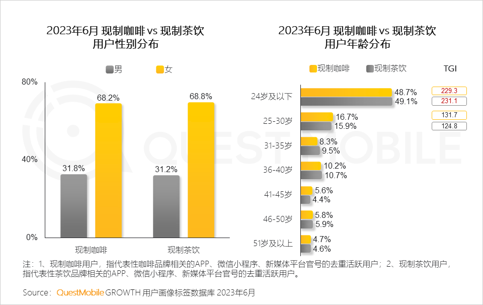 QuestMobile数据显示,现制咖啡与现制茶饮人群,24岁及以下人群占比分别为48.7%、49.1%。