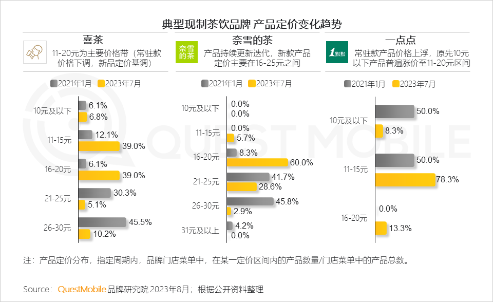 QuestMobile数据显示,喜茶定价在11-20元间的单品数量占78.0%,奈雪的茶定价在16-20元之间的单品数量占60.0%,值得注意的是,一点点则“逆流而上”,将原先10元以下产品上浮至11-20元区间。