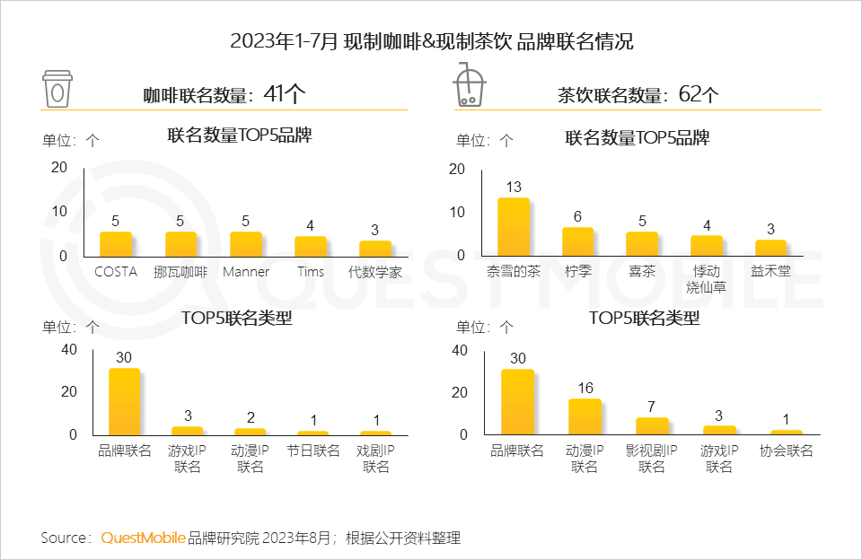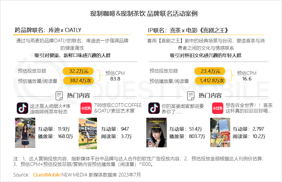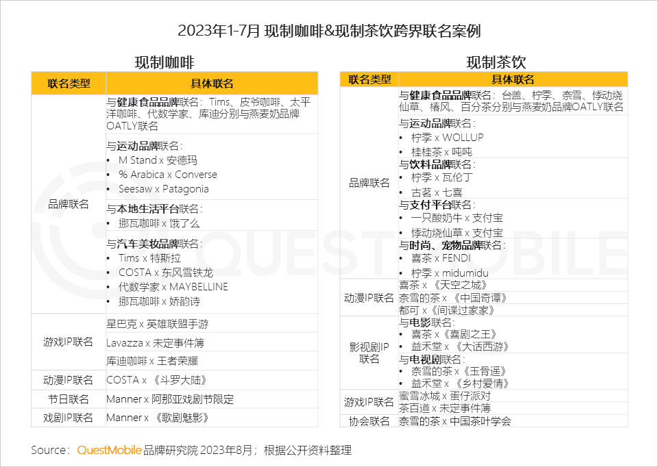 与此同时,借助新的营销工具、新的渠道带来的销售也持续攀升,跨界联合营销、新概念营销以及新渠道,都已经成为行业主流,比如,2023年6月,抖音本地生活团购板块,咖啡团购TOP1商品为单价8.8元的库迪冰饮系列咖啡,茶饮团购TOP1商品为单价8.7元的蜜雪冰城鲜橙大王桶……