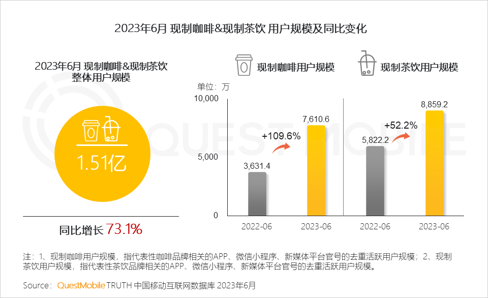 QuestMobile数据显示,随着消费持续复苏,高频、刚需和习惯性三大特点,造就了现制咖啡和茶饮市场的快速发展,尤其是平民化定价的品牌大量出现,饮品回归消费本质,走向“大众化”消费,吸引了大量用户进入,截止到今年6月,二者线上整体用户规模达到1.51亿左右,其中,现制咖啡用户规模达到7,610.6万,同比增长了109.6%,现制茶饮用户规模达到了8,859.2万,同比增长52.2%,二者差距在相对缩小。