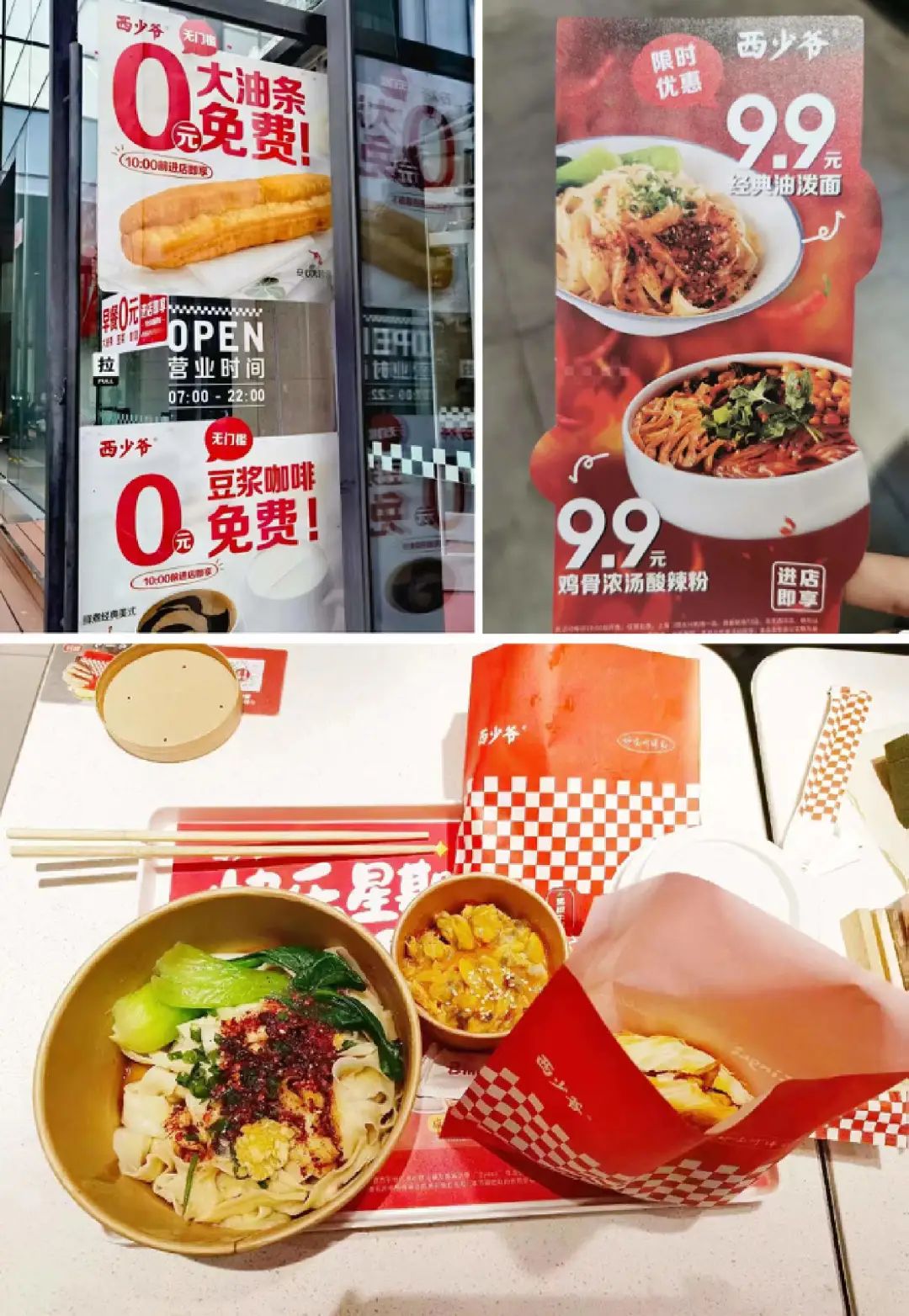 比如第一波开始降价的快餐品牌。西少爷在9.9酸辣粉后,经典油泼面也限时回归9.9元,甚至开启了一波官方亲自下场教你0元薅羊毛:早餐时段,推出5元随心配,包子、油条、咖啡、豆浆等自由组合,叠加每日无门槛0元领油条、豆浆咖啡,以及代金券活动,直达0元吃喝。