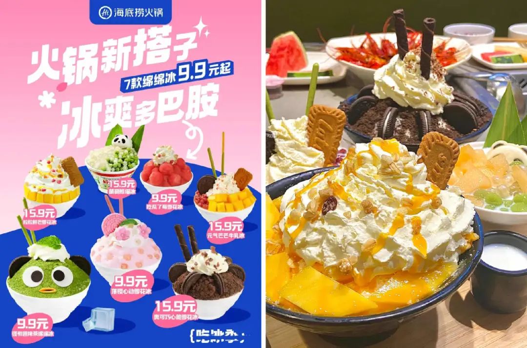海底捞7月底多地上新的多巴胺冰品,包含雪花冰、牛乳冰、绵绵冰等7款产品在内,定价9.9元起;年初被小龙坎并购的重庆火锅品牌蜀大侠,将于8月15日后开启9.9元代100元代金券系列活动。