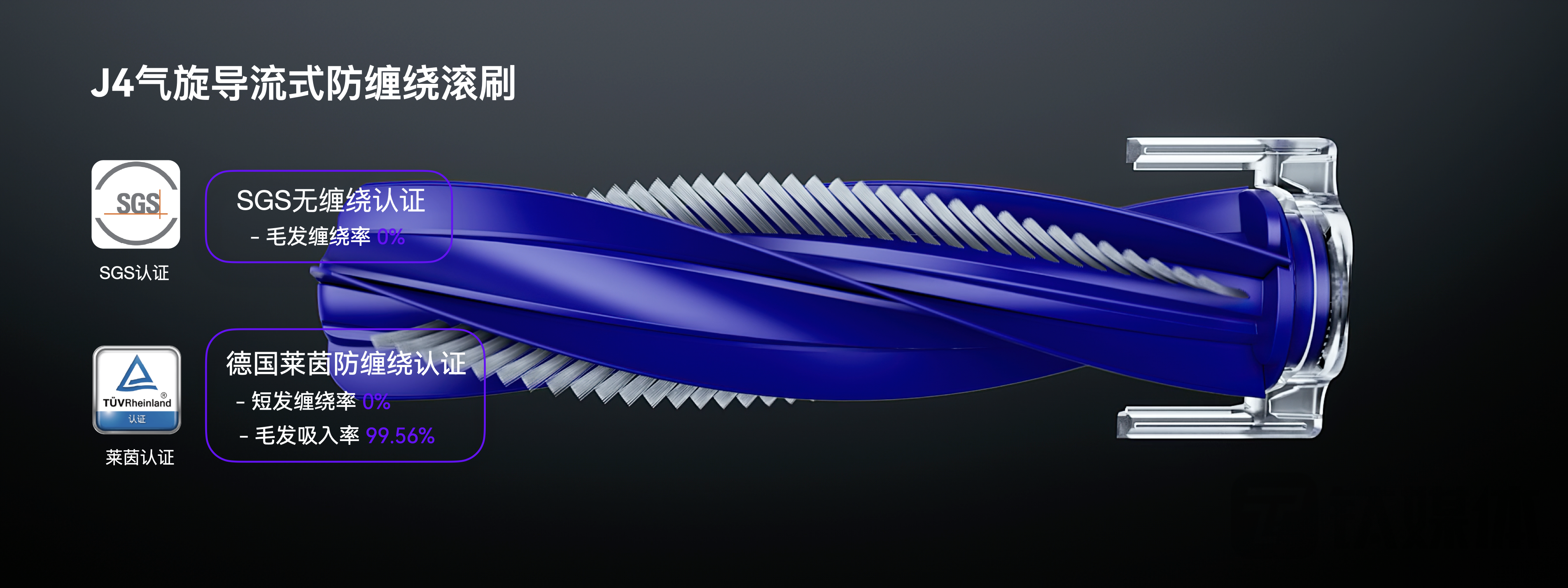 在“维护更轻松”方面,云鲸J4采用全新的气旋导流式防缠绕滚刷,不仅具备不缠毛发、呵护地板、清洁力强等功效,还具有超静音的特点。值得一提的是,其防缠绕功能获得了SGS和莱茵两大国际权威认证。