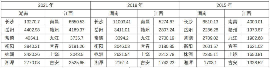 2015年,株洲的GDP比江西老二赣州还多361亿,湘潭的GDP也只比江西老三九江少199亿。然而仅仅六年之后,株洲的GDP却比赣州少了749亿,湘潭与九江的差距进一步扩到965亿。