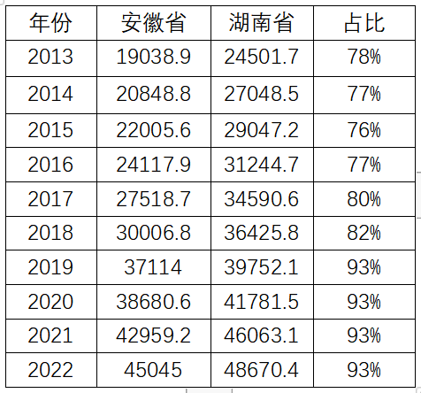 而一直在湖南身后追赶的安徽,更是步步紧逼。安徽与湖南的GDP比值,从2013年的78%,一路攀升至2022年的93%。有不少人认为,安徽超越湖南,指日可待。
