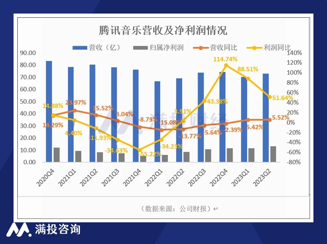 8月15日,中国在线音乐平台腾讯音乐(股票代码:TME)发布了截至2023年6月30日的第二季度未经审计财务报告。财报显示,腾讯音乐二季度实现营收为72.86亿元,较2022年同期的69.05亿元同比增长5.52%;录得归属净利润12.98亿元,较去年同期的8.56亿元同比大增51.64%。