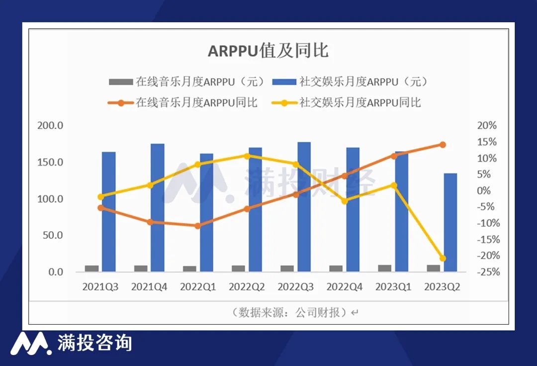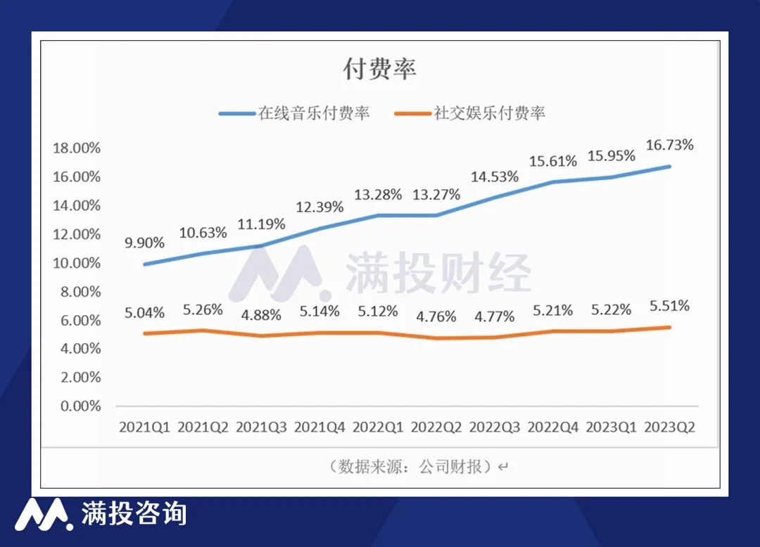 但在精细化的用户运营、更丰富的订阅权益和更具吸引力的音乐内容等运营措施下,共同促成了腾讯音乐在线音乐付费用户数的增长。2023年第二季度,公司在线音乐业务的付费用户总数达到9,940万的历史新高,付费率达到16.73%。社交娱乐的付费用户则继续下滑至750万,同比-5.1%,付费率为5.51%。