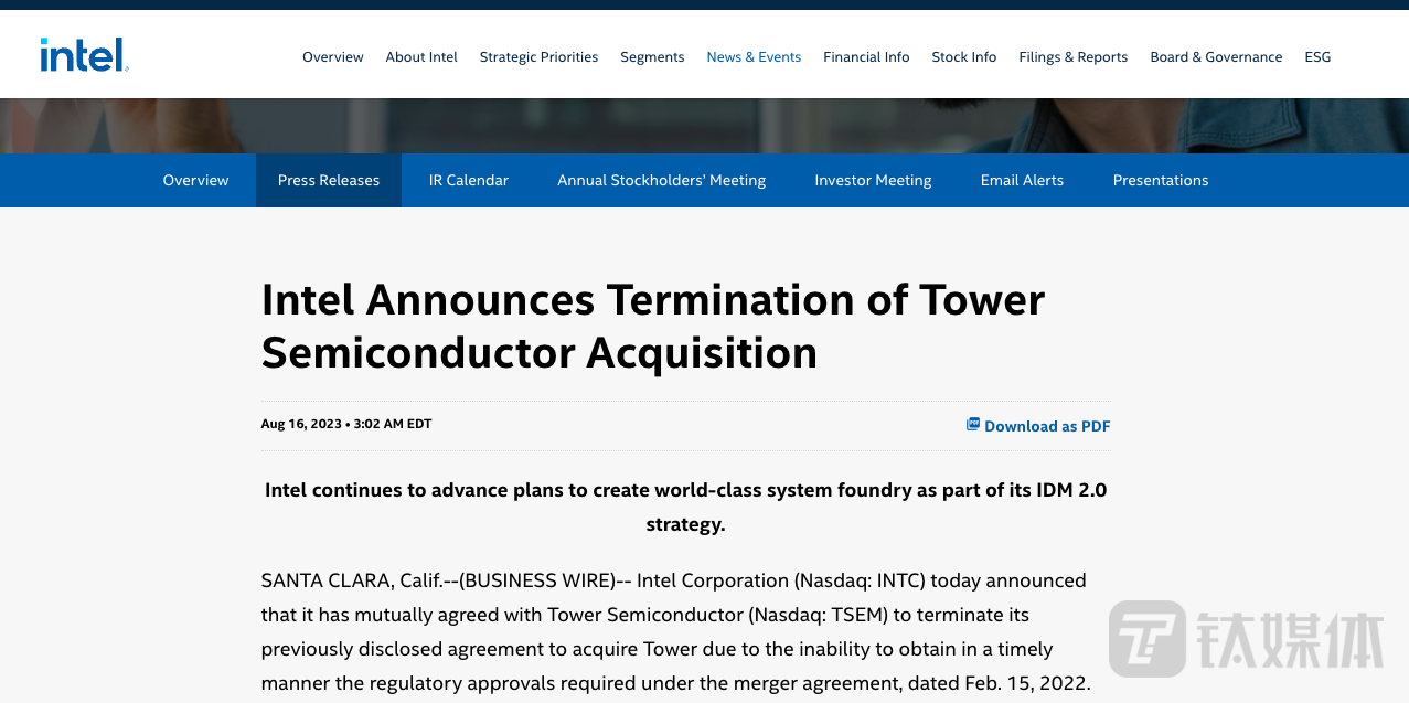 钛媒体App获悉,北京时间8月16日下午,芯片巨头英特尔(Intel,NASDAQ:INTC)宣布,由于无法获得以色列芯片制造公司高塔半导体(Tower Semiconductor,NASDAQ:TSEM)公司的股份,其已与高塔半导体双方达成一致,终止之前2022年2月披露的收购协议。