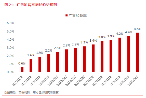 东方证券的研报分析也印证了这一点,其预估视频号广告加载率最终目标可以达到10%,但这个过程比较缓慢,预测2023/2024/2025年Q4视频号广告加载率将分别为2.8%、3.8%、4.8%。