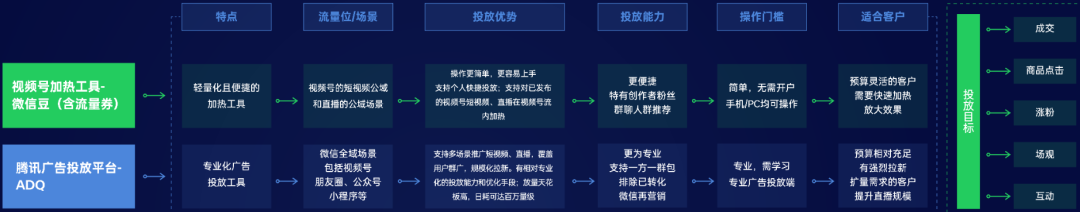 在微信豆和ADQ的选择上,前者是在视频号场景内投放,后者则可以在整个微信生态内投放,包括视频号、朋友圈、公众号等。