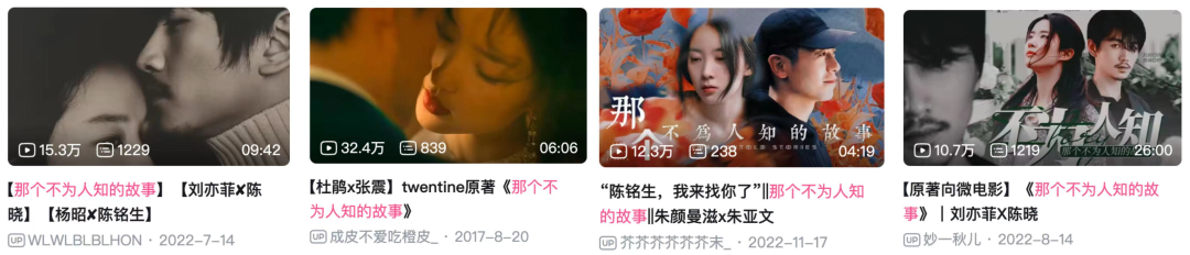 比如大热IP《那个不为人知的故事》在B站已有杜鹃/张震、刘亦菲/陈晓,以及朱颜曼滋/朱亚文等多部拉郎剪辑,这在某种程度上甚至会影响后续 IP影视化的选角。
