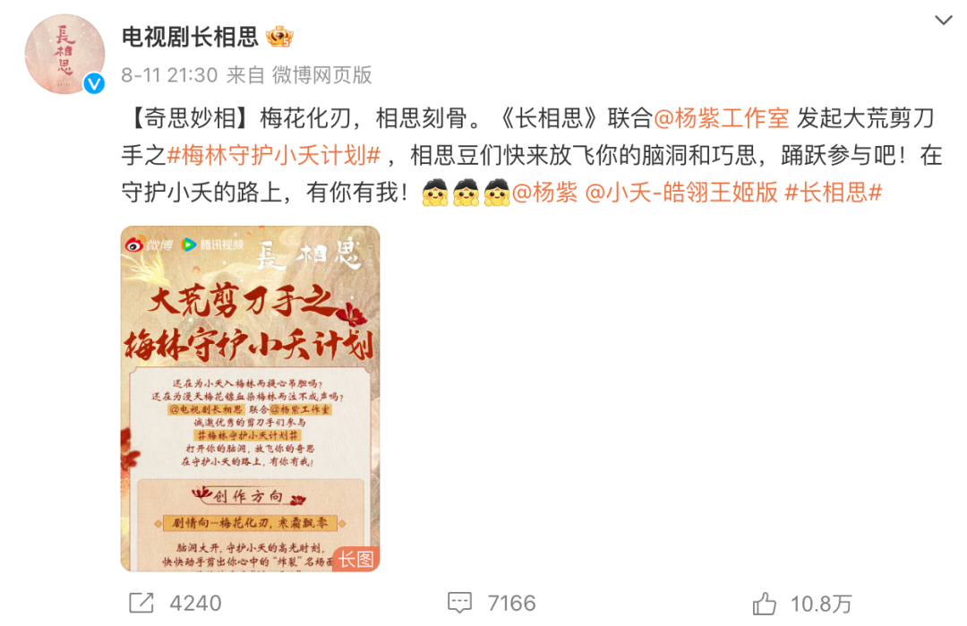 “你真是最听劝的剧方。”在宣布与杨紫工作室合作,联合发起话题词为“梅林守护小夭”二创计划后,电视剧《长相思》的官微底下聚集了大量此类评论。