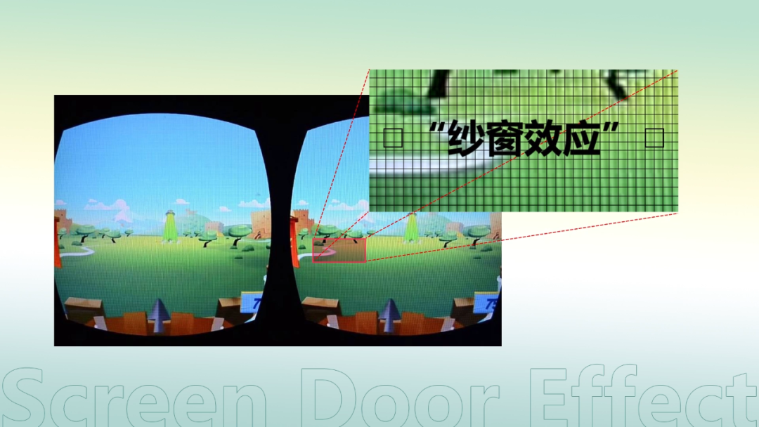 比如索尼初代的PSVR,用起来相当于在2.5米距离看一块226寸的屏幕。这就导致在很多VR设备上,用户能看到像素点之间黑色网格状的空隙,也就是所谓的“纱窗效应”。