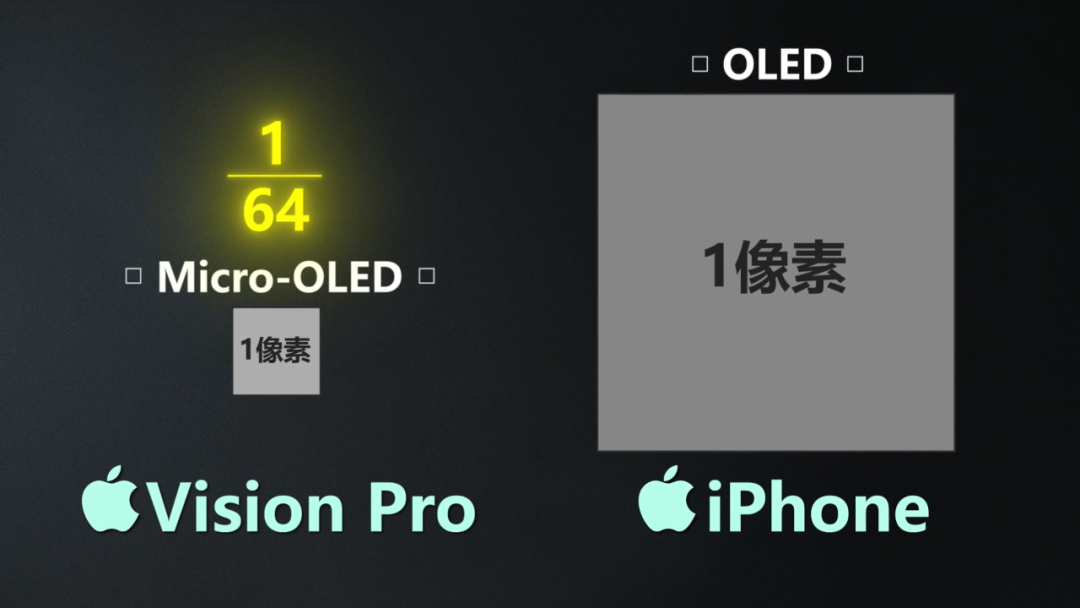 这种工艺带来了两个好处,首先就是缩小了像素点的面积,像苹果Vision Pro单像素的大小只有iPhone的1/64,让2、3英寸的屏幕装下4K分辨率成为了可能。