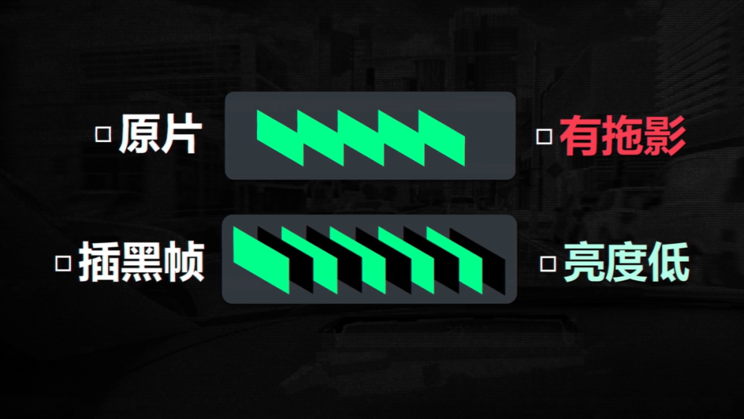 另外还有一个办法,可以通过给画面插入黑帧,利用人眼错觉让画面显得更流畅。这种解决方案虽然不需要高算力,但因为黑帧的加入会让画面亮度明显降低。
