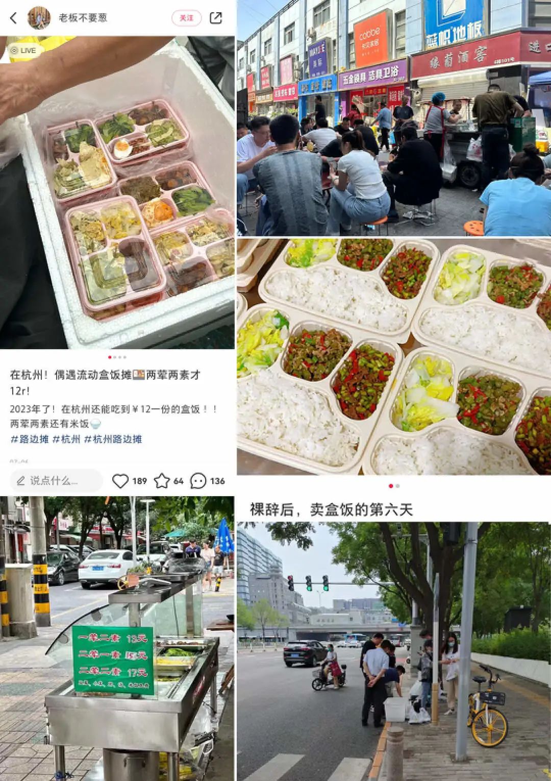 在社交平台上,内参君观察到,太原、杭州、长沙、石家庄、重庆等城市,均有这样的创业项目;此外,在北京,“午餐不自由”的白领们,也纷纷“舍弃老乡鸡”等品牌快餐,投奔性价比,在CBD、望京、大望路等写字楼聚集的地方,均有这样的推车盒饭,有的甚至“开着路虎卖盒饭”。