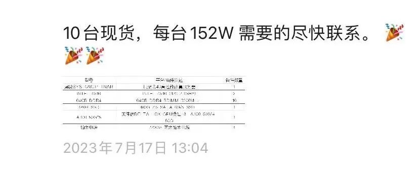 相比水涨船高的A800单片行情,A100服务器整机的价格浮动并不大。在该卖家的朋友圈作者看到,2周前,安装有8块A100芯片的服务器,售价在每台140万——145万元之间。但服务器的货源依旧紧缺,卖家告诉作者:“前几天到货10台服务器,一个星期之内就被上海买家订完了”。