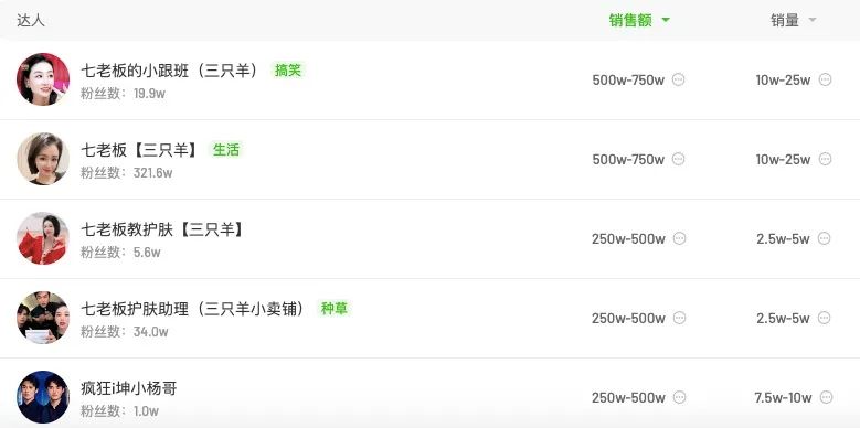 根据果集·飞瓜数据,娇润泉和429位直播带货达人合作,92.76%的销售额都来自达人推广。贡献最多的是疯狂小杨哥和他旗下“三只羊”的若干个矩阵直播账号。