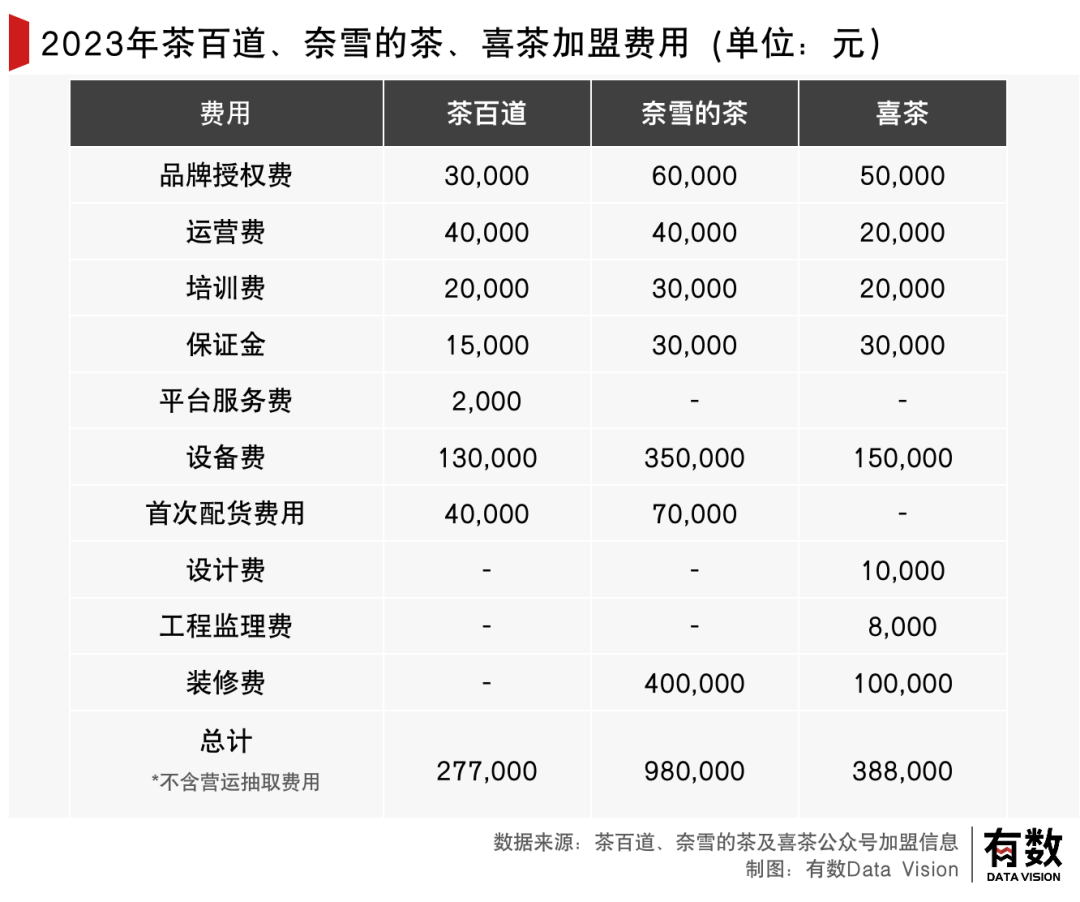 相比之下,平均每家茶百道的加盟费在2.7万左右,前期投入为34.7万[7],比蜜雪冰城高出一大截。但和动辄百万加盟费的奈雪相比,茶百道又显得“平易近人”。