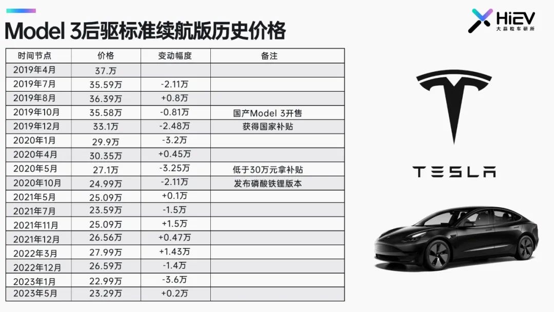 HiEV统计了Model 3中国市场价格变化,以后驱标准续航版为例,变化如下: