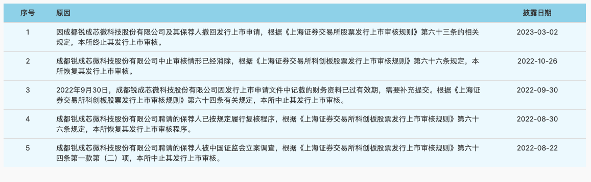 2022年8月,锐成芯微聘请的保荐人被中国证监会立案调查,上交所因此中止其发行上市审核。