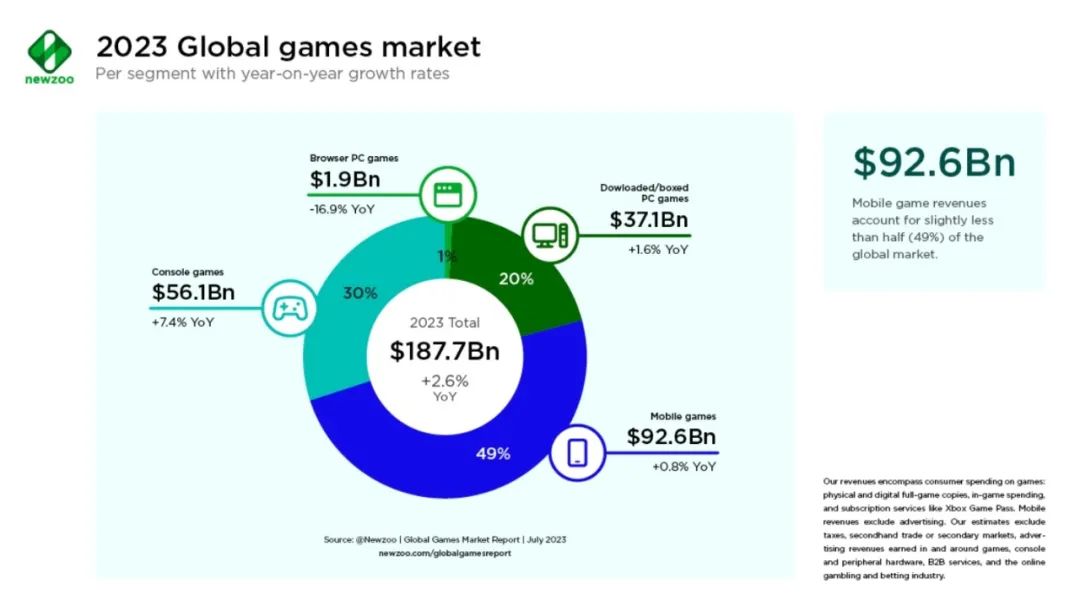 根据Newzoo《2023全球游戏市场报告》显示,手游仍是玩家最大的消费平台,但增速预计仅有0.8%,而主机游戏与PC端游戏合计占据整个游戏市场一半份额,前者预估增速可达7.4%,将成为整个游戏市场增长火车头,后者增速则为1.6%。