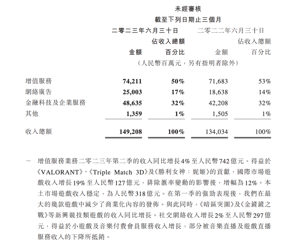 财报显示,以游戏为主的增值服务在总营收中的占比从上年同期的53%降至50%,二季度营收同比增长4%至742.11亿元。腾讯二季度本土市场游戏收入为318亿元,与去年同期持平,较上一季度环比下降了9.5%,《暗区突围》及《金铲铲之战》等新兴竞技类游戏的收入同比增长。