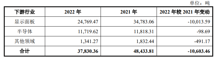 润玛股份主营产品下游行业主要是显示面板、半导体。2022年,主营产品销量较2021年度下降1.06万吨。其中显示面板销量下滑幅度最明显,较2021年减少了约1万吨。![]()