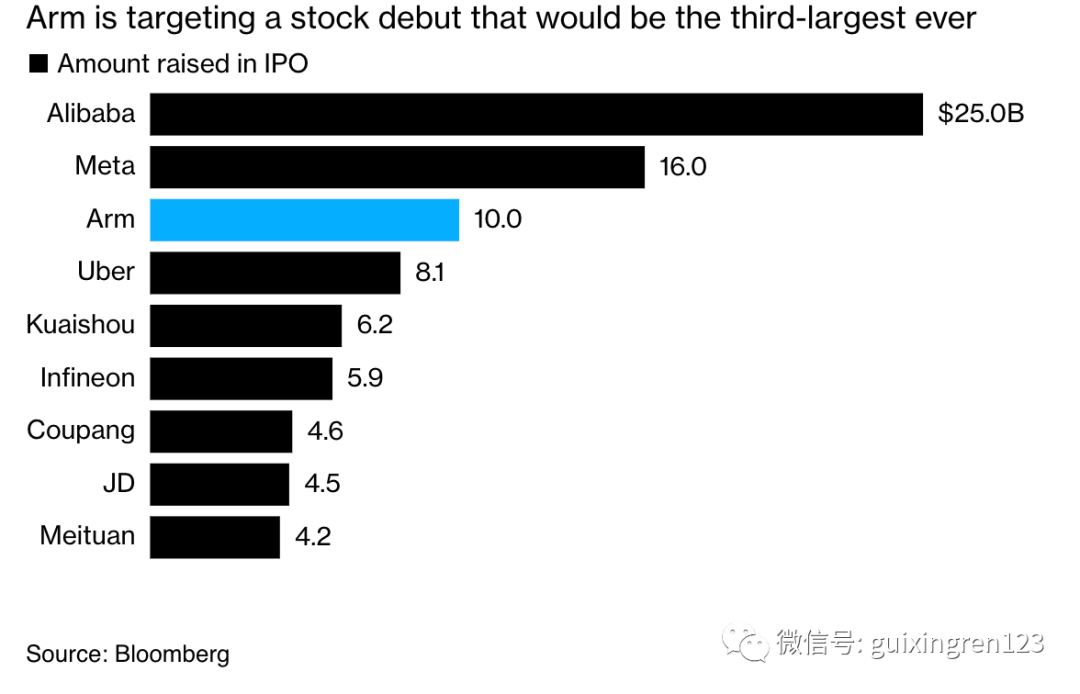 周一,Arm 在纳斯达克股票市场公开申请首次公开募股 (IPO),股票代码为 ARM。在一份声明中,Arm 没有透露将上市的股票数量,也没有透露预计的上市价格。不过,赶在人工智能浪潮上,市场普遍对 Arm 的这次 IPO 持有乐观态度,不少分析师预计它的估值在 700 亿美元左右,将会在 IPO 中筹集 80 亿至 100 亿美元。这也让它有望成为有史以来第三大科技公司 IPO,仅仅次于阿里巴巴和 Meta 的前身Facebook。
