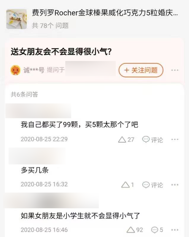 不仅身边购买且拿它送礼的人寥寥;在某些平台的费列罗购买页面上,还会看到有人提问: