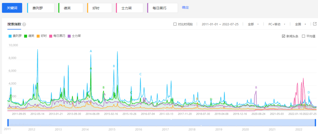 根据百度指数显示,2012~2015年间,每年的2月14日情人节之前,费列罗的指数加速飞涨,远超德芙、好时等同行,指数多次达到德芙的两倍。