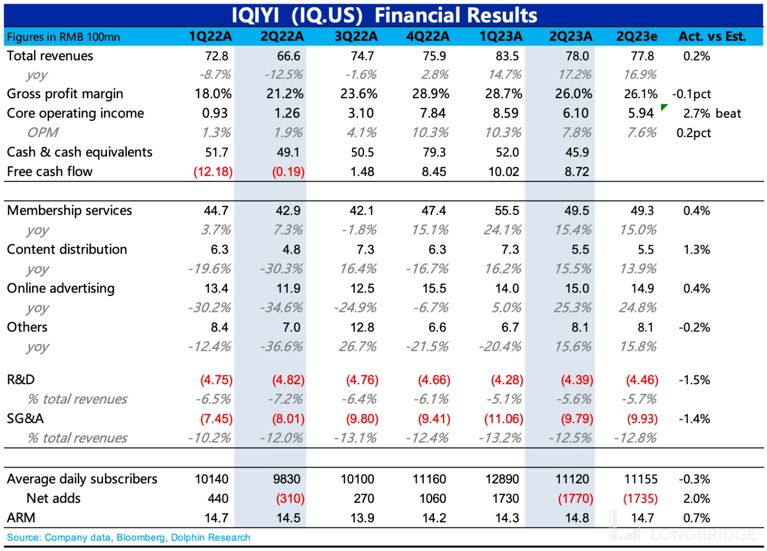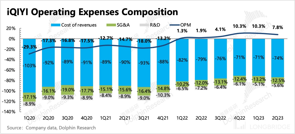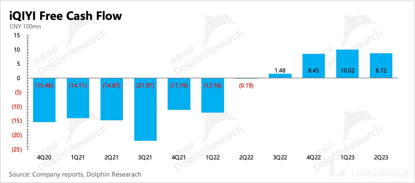 在经营费用整体控制得当下,最终爱奇艺二季度实现 GAAP 下净盈利 3.7 亿元,经营利润 6.1 亿元,加回股权激励、无形资产摊销后的 Non-GAAP 经营利润为 7.9 医院,利润率为 10%,环比下降 2pct。