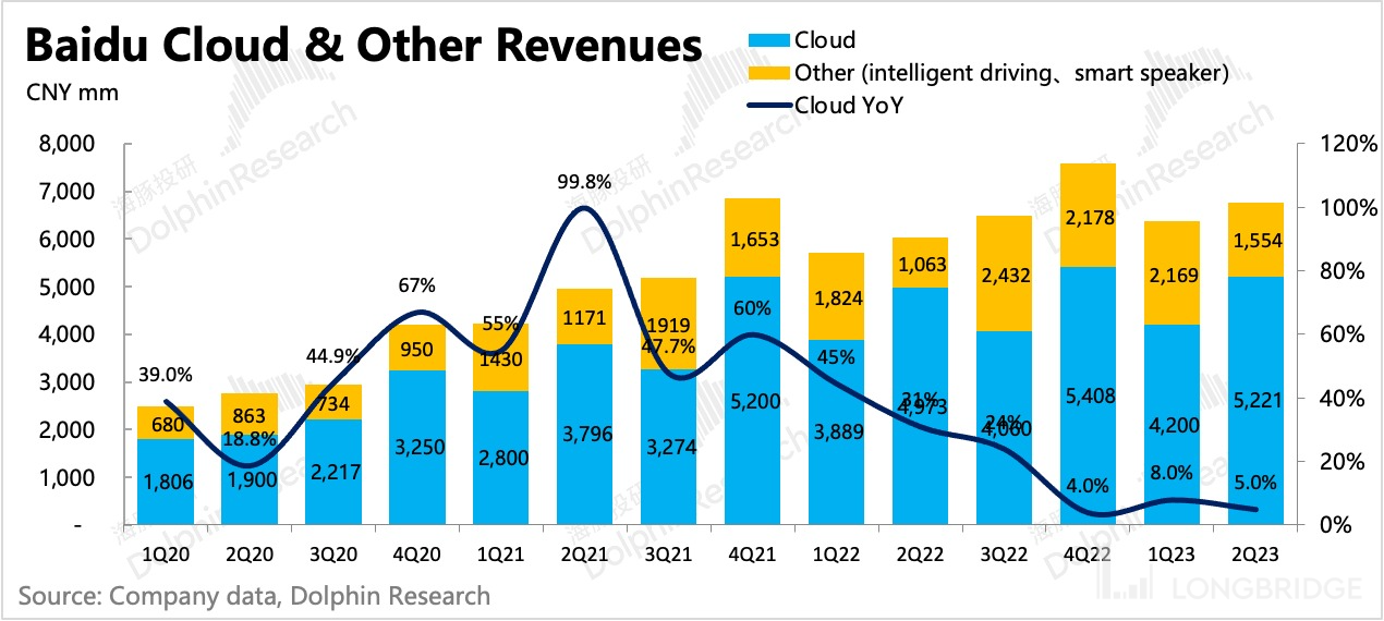 百度的智慧云中,有不少是与地方政府合作的智慧交通解决方案收入。在近三年由于地方政府举债变难,规模萎缩,因此今年以来也削减了这类 “锦上添花” 型的城市基建。因此二季度智慧云增速继续放缓至 5%,海豚君预计智慧交通的项目需求可能会继续疲软。