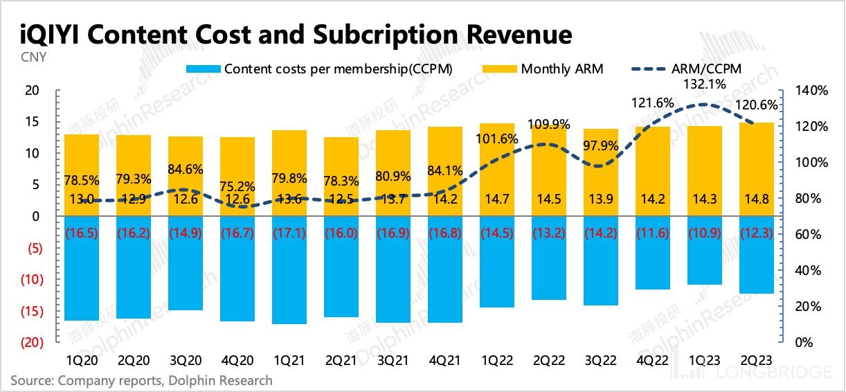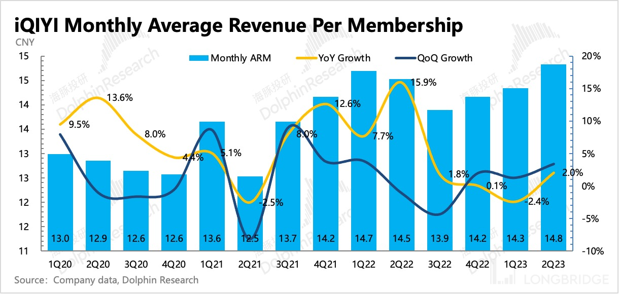 二季度因为内容上缺爆款,因此在优酷多个剧集霸榜时,爱奇艺的用户订阅数又回落到了去年四季度的水平,不过这种流失还不算太糟糕,和最惨的去年二季度相比,还是多了 13% 的用户。同时因为去年底进行了一波提价,ARM 同比增长 2%,量价共同拉动订阅收入增长 15%。