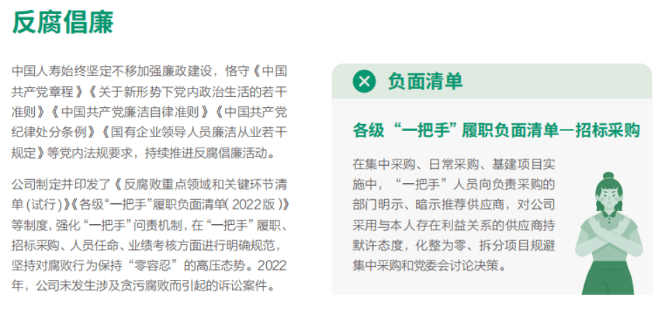 再回到中国人寿的ESG报告上,缺憾之处在于,对于廉洁治理、责任治理等内容,报告仍然以定性描述为主,缺乏定量分析,更没有具体例子展现。