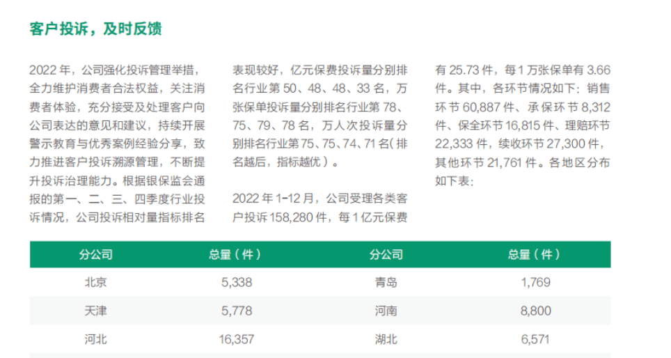报告还详细罗列了2022年全年客户投诉情况,报告期内,公司受理各类客户投诉158,280件,每1亿元保费和每1万张保单客户投诉量分别为25.73件和3.66件。