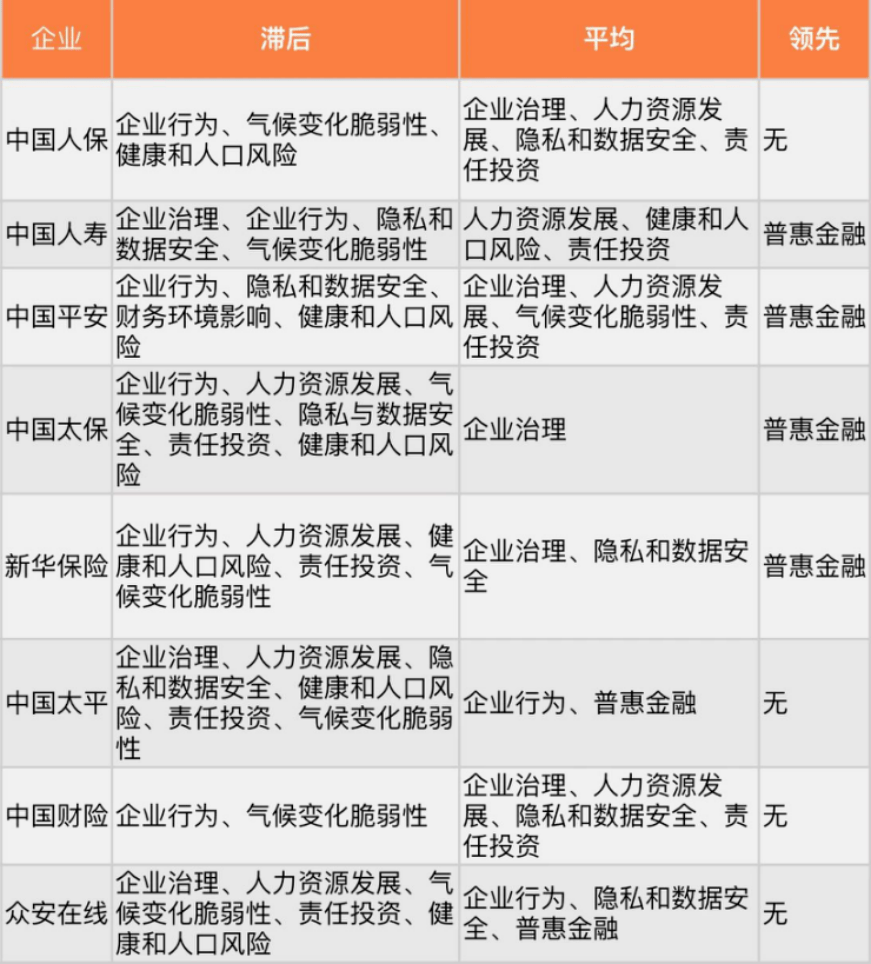 国内险企在“气候变化脆弱性、公司治理、隐私和数据安全”等议题上的表现拖累了评级。